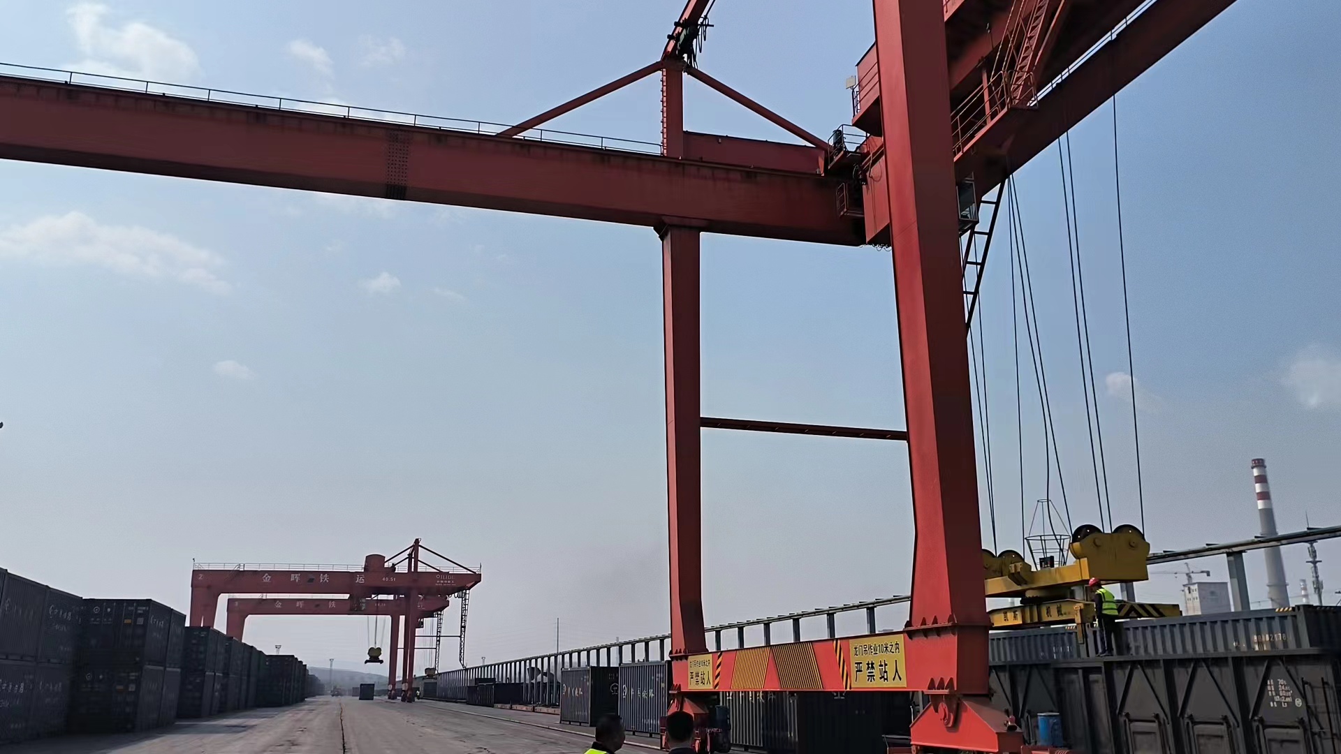 門式起重機是橋式起重機的一種變形,又叫龍門吊。主要用于室外的貨場、料場貨、散貨的裝卸作業(yè)。門式起重機具有場地利用率高、作業(yè)范圍大、適應(yīng)面廣、通用性強等特點,在港口貨場得到廣泛使用?! ∷慕饘俳Y(jié)構(gòu)像門形框架,承載主梁下安裝兩條支腳,可以直接在地面的軌道上行走,主梁兩端可以具有外伸懸臂梁?! ¢T式起重機(又稱龍門起重機)是橋架通過兩側(cè)支腿支撐在地面軌道上的橋架型起重機。在結(jié)構(gòu)上由門架、大車運行機構(gòu)、起重小車和電氣部分等組成。有的門式起重機只在一側(cè)有支腿,另一側(cè)支撐在廠房或棧橋上運行,稱作半門式起重機。門式起重機的門架上部橋架(含主梁和端梁)、支腿、下橫梁等部分構(gòu)成。為了擴大起重機作業(yè)范圍,主梁可以向一側(cè)或兩側(cè)伸出支腿以外,形成懸臂。也可采用帶臂架的起重小車,通過臂架的俯仰和旋轉(zhuǎn)擴大起重機作業(yè)范圍。