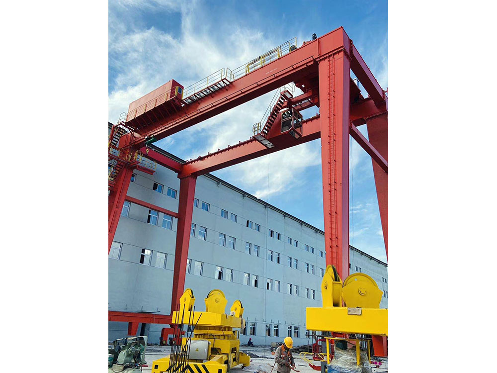 它的金屬結(jié)構(gòu)像門形框架,承載主梁下安裝兩條支腳,可以直接在地面的軌道上行走,主梁兩端可以具有外伸懸臂梁。